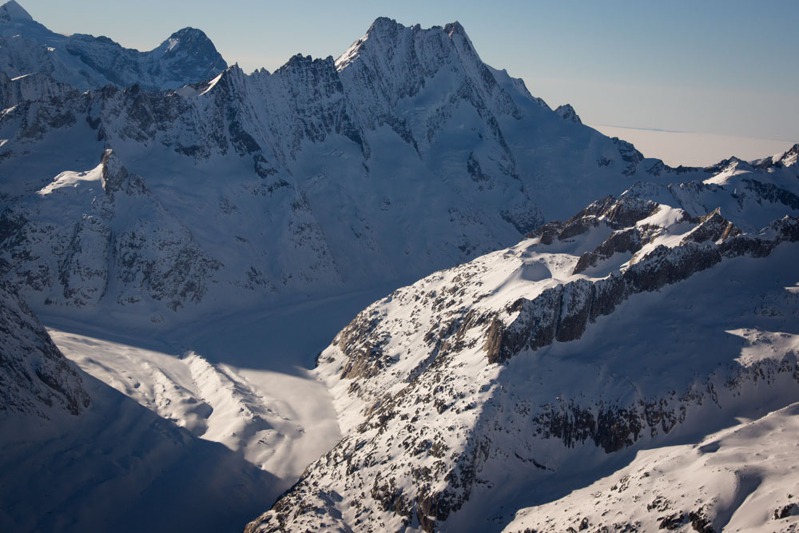 Vlevo vrcholek Jungrafu, vpravo Monch, směrem dolů začátek ledovce Aletsch, Bernské Alpy, Švýcarsko