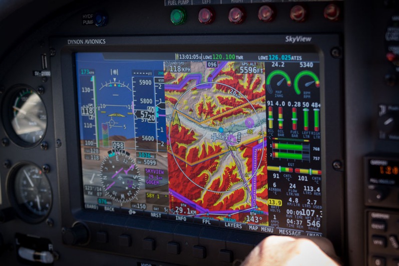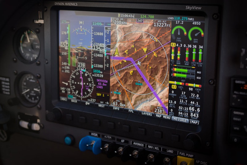 Pohled na dráhu 26 letiště Sion při druhém pokusu o přistání, kdy jsou pro nás již rozsvícená světla. Při prvním pokusu nebyla dráha v oparu osvíceném zapadajícím sluncem vidět vůbec.