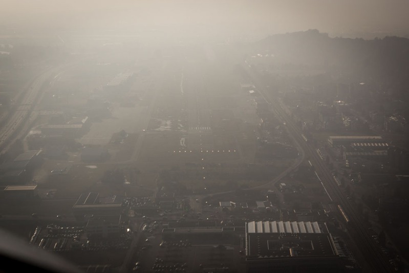 Ve 13.40 na letišti Innsbruck – slunce právě rozpouští zbytky nízké oblačnosti