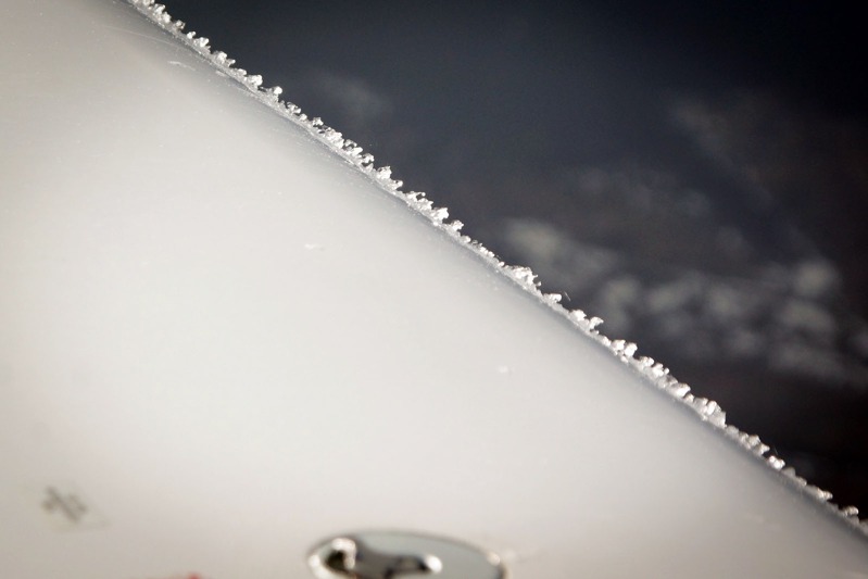 Detail námrazy, která se vytvořila na náběžné hraně křídla při letu v okolí vlhkých mraků