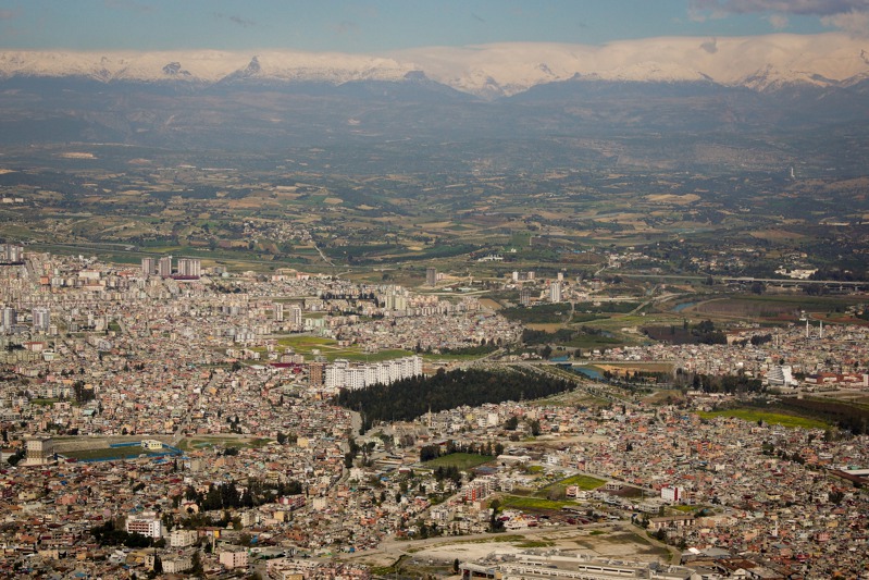 Historické město Tarsus ležící asi 15 minut letu západně od Adany. V pozadí pohoří Taurus tyčící se až do výše kolem 3500 mnm.