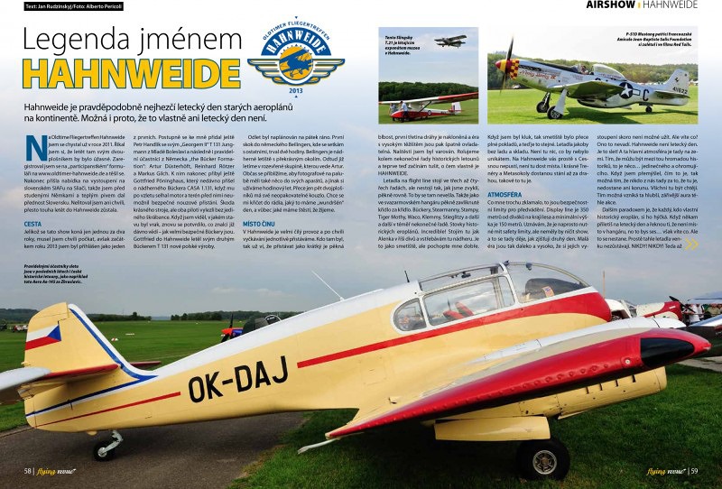 Jelikož se tato show koná jen jednou za dva roky, musel jsem chvíli počkat, avšak začátkem roku 2013 jsem byl přihlášen jako jeden z prvních. Postupně se ke mně přidal ještě Petr Handlík se svým „Georgem II“ T 131 Jungmann z Mladé Boleslavi a následně i pravidelní účastníci z Německa „the Bücker Formation“: Artur Düsterhöft, Reinhard Rötzer a Markus Gilch. K nim nakonec přibyl ještě Gottfried Pöninghaus, který nedávno přišel o nádherného Bückera CASA 1.131, když mu po vzletu selhal motor a terén před nimi neumožnil bezpečné nouzové přistání. Škoda krásného stroje, ale oba piloti vylezli bez jediného škrábance. Když jsem viděl, v jakém stavu byl vrak, znovu se potvrdilo, co znalci již dávno vědí – jak velmi bezpečné Bückery jsou. Gottfried do Hahnweide letěl svým druhým Bückerem T 131 nové polské výroby.