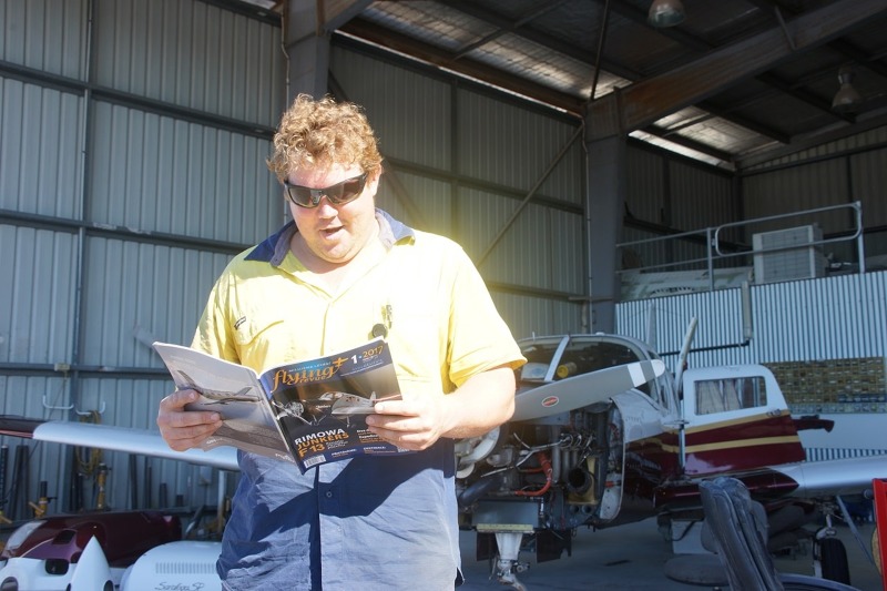 Letecký mechanik v australském Darwinu zaujatě studuje Flying Revue.