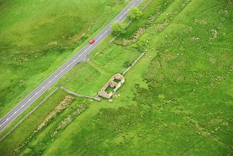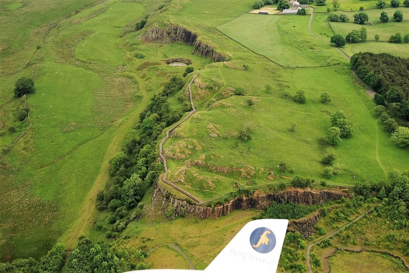 Dalším mým cílem byla Hadriánova zeď či val na pomezí Skotska a Anglie. Najít ji nebylo jednoduché – jednak není příliš mohutná, také už není úplně celistvá a také místní políčka jsou oddělená kamennými zídkami, které z letadla vypadají dost podobně jako ta Hadriánova. Ale našel jsem ji! A nafotil a nafilmoval jsem ji, samozřejmě. Dovedla mě až na letiště Carslisle (EGNC), kde jsem natankoval a pokračoval na jih kolem Manchestru, přes Coventry a Oxford na jih CTR Heathrow.