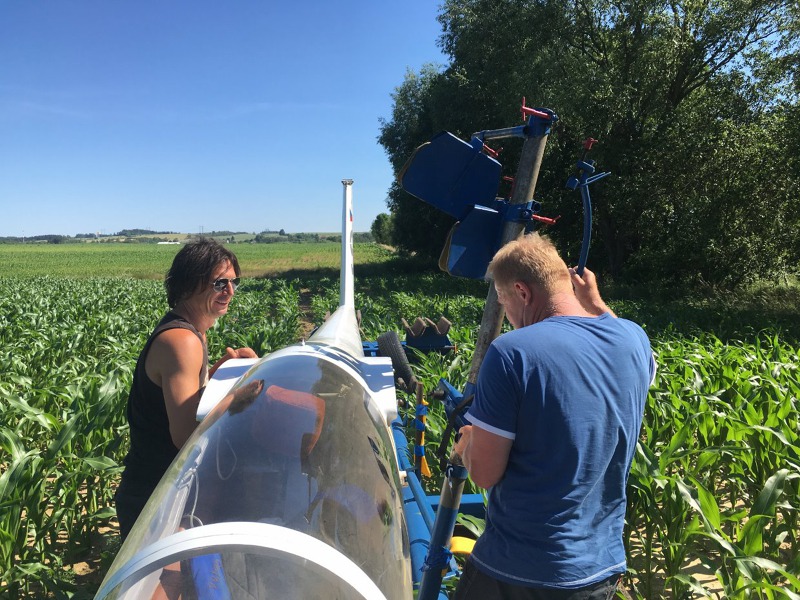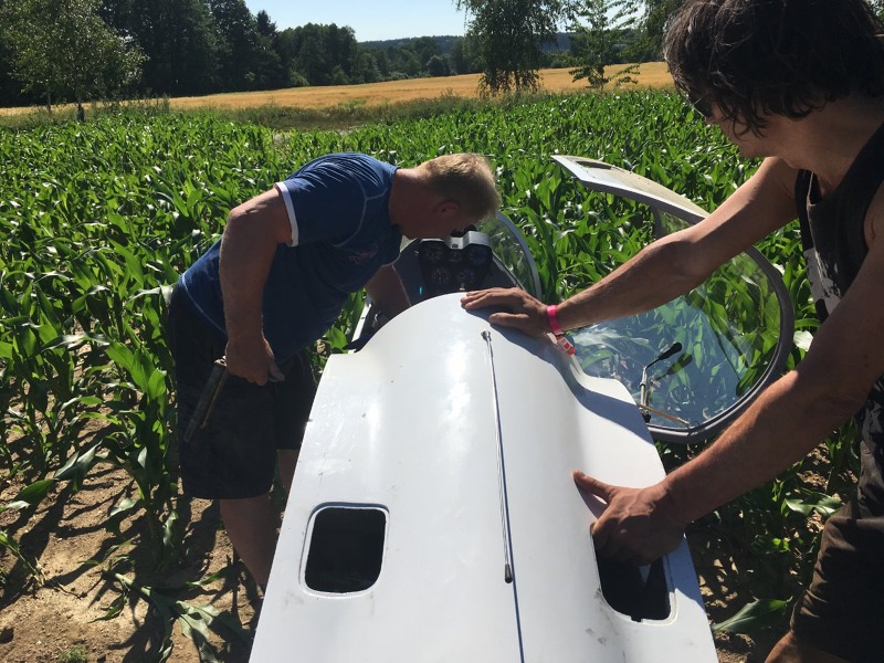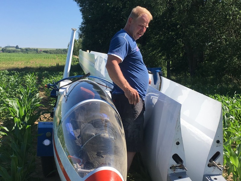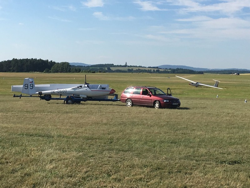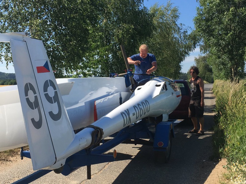 Letadlo vytlačujeme na okraj pole, během tři čtvrtě hodiny je rozebrané a na transportním vozíku. Kolem 16.45 vyjíždíme a v 18.00 přijíždíme na letiště Benešov, odkud jsem kolem před polednem odstartoval.