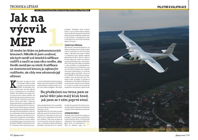 Na přeškolení na twina jsem se začal těšit jako malý kluk hned od chvíle, kdy jsem se v něm poprvé svezl a rozhodl se, že si vícemotorovou kvalifikaci odlétám. Těšil jsem se nejen na to, že se naučím zase něco úplně nového, vyzkouším si létat s pořádným letadlem, ale hlavně na to vlastní polétání. Začněme však trochou teorie. V první části tohoto článku bych se rád věnoval právě teoretické přípravě před začátkem přeškolení a v druhé části, v následujícím vydání Flying revue, si povíme o vlastním létání s twinem.