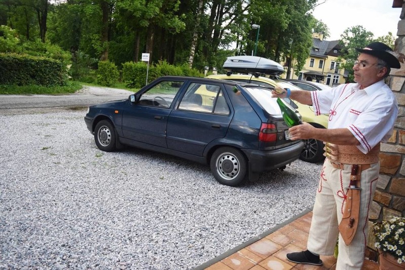 Ján Skladányi předvádí, že jeho alter ego Bača to s valaškou opravdu umí - zde s ní právě otevřel láhev šampusu.