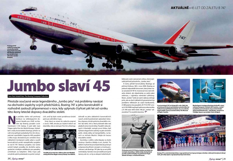 Přestože současná verze legendárního „Jumbo jetu“ má problémy navázat na obchodní úspěchy svých předchůdců, Boeing 747 a jeho konstruktéři si rozhodně zaslouží připomenout v roce, kdy uplynulo čtyřicet pět let od vzniku této ikony letecké dopravy dvacátého století.