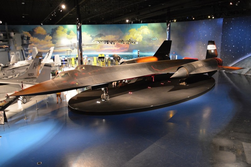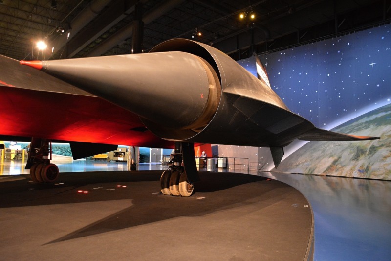Hlavní dominantou muzea je neuvěřitelný stroj Lockheed SR-71B (Blackbird) s imatrikulací #61-7956, který také létal pod organizací NASA a to s číslem 831. Poprvé vzlétl v roce 1964 a za celou svojí aktivní etapu nalétal neuvěřitelných 3967,5 hodin. Jednalo se o dvoumístný cvičný stroj, všimněte si výčnělku druhé kabiny, který kazí, či doplňuje (?) extravagantní vzhled letadla. Je již posledním exemplářem na světě z verze 71B a proto možnost si tento stroj detailně prohlédnout je opravdovým zážitkem. Detailnější popis letadla a jeho historii se lze dozvědět na infopointu, který je kousek od výškovky Blackbirda. Pán se zde nudil a můj zájem ho ani moc neotravoval.
