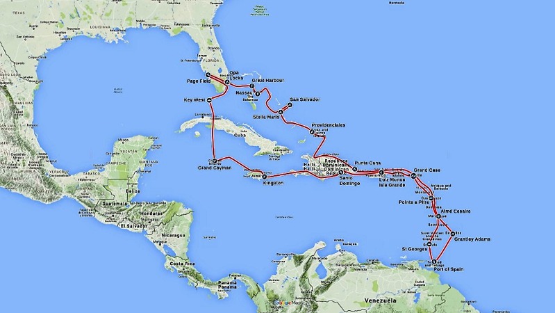 Naše expedice se blíží k závěru, při letu nad ostrovem Svatého Bartoloměje si tu neodpustím slíbené letmé přistání. Tentokrát je to opravdové touch and go; hned po doteku přidávám plyn a doufám, že ještě před mořem nabereme rychlost dostatečnou na vzlet, což u cessny činí cca 85 km/h. Daří se a tak můžeme zamířit zpátky na Floridu. Cestou ještě navštívíme třeba bahamský ostrov San Salvador, kde můžeme opět popustit na uzdu fantazii – právě tady údajně poprvé na americkém území přistál v roce 1492 Kryštof Kolumbus.