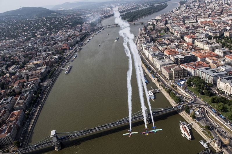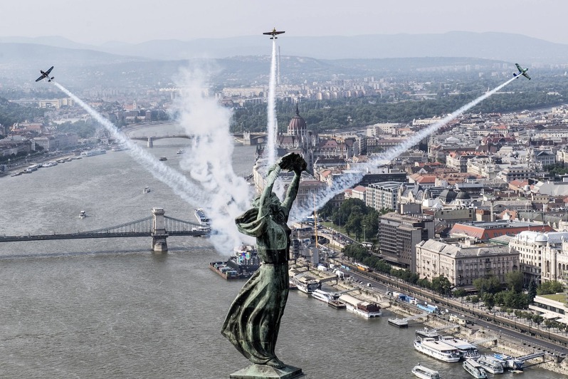 Teaser nadcházejícího závodu v Budapešti. Zdroj: RBARS Besenyeim nad Budapeští Oceněním jeho aktuálního postavení bylo pozvání do sestavy s otcem zakladatelem Red Bull Air Race Peterem Besenyeim a aktuálním lídrem místrovství světa Yoshihide Muroyou. Besenyei, maďarská ikona akrobatického létání, která je už druhou sezonu v leteckém důchodu, českého a japonského pilota provedl nad městem, kde se v neděli poletí závod.