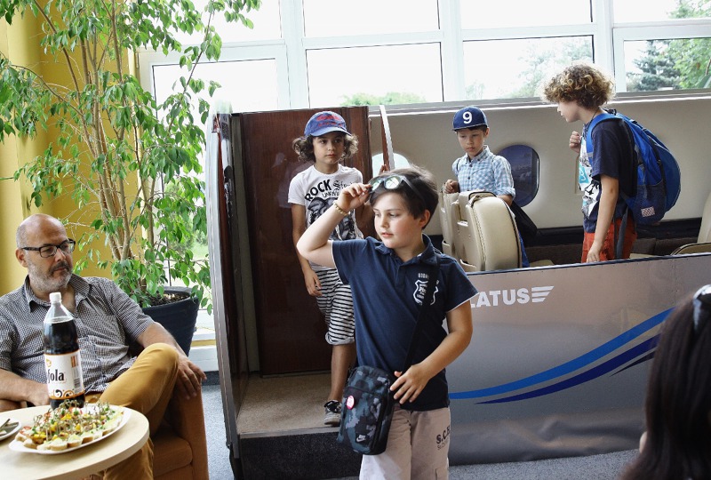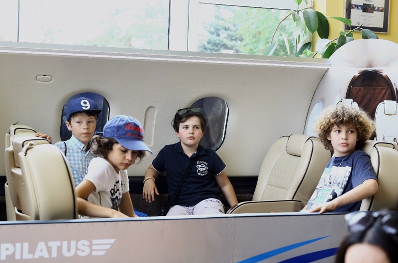 Dětští herci okupovali v lobby příbramského letiště model kabiny Pilatusu.