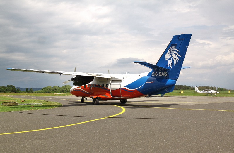 Na příbramském letišti probíhaly zároveň tandemové seskoky. L-410 právě se zájemci o seskok pojíždí na start.