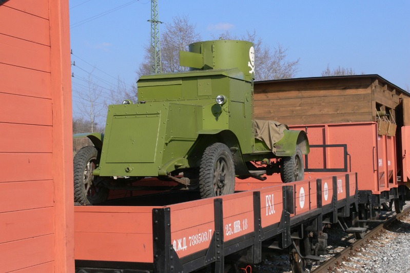 Plošinový vagón s replikou obrněného jednověžového vozidla Austin.