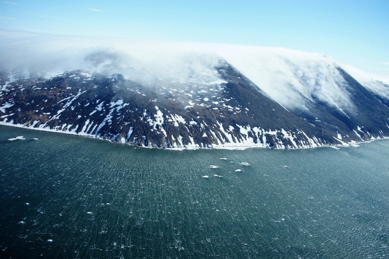 Let odpovídal místu - jednak je tu vojenské pásmo ADIZ (dobře to dopadlo), jednak tudy vede hranice mezi USA a Ruskem, kterou jsem nesměl přeletět. K tomu mi hrál tango drsný studený vítr se sněžením, ve vodě pode mnou plavaly kry, a tak o její teplotě není vcelku pochyb. Ale podařilo se, a já mám tohle magické místo nafocené a nafilmované.