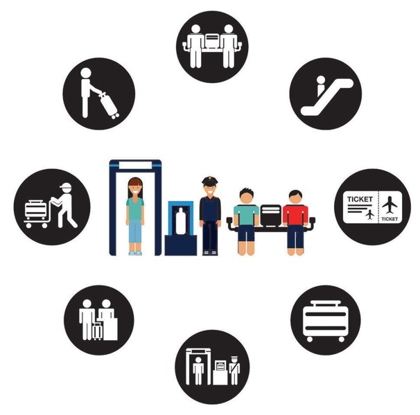 Příklad piktogramů, s jakými se mohou cestující na letištích setkat.