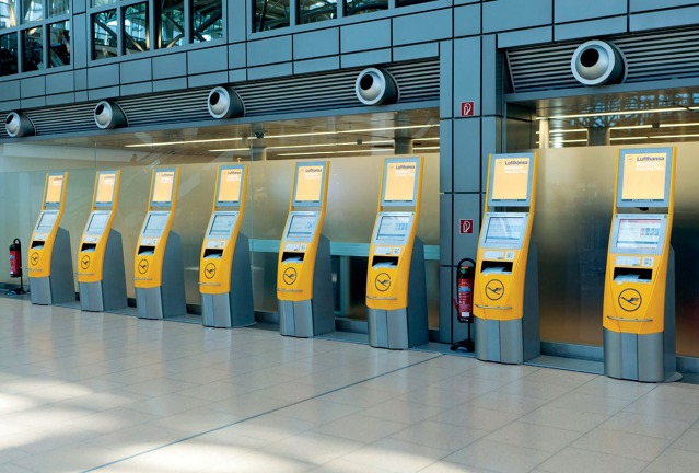 Samoobslužné odbavovací stojany, které po identifikaci vystaví cestujícímu palubní vstupenku.