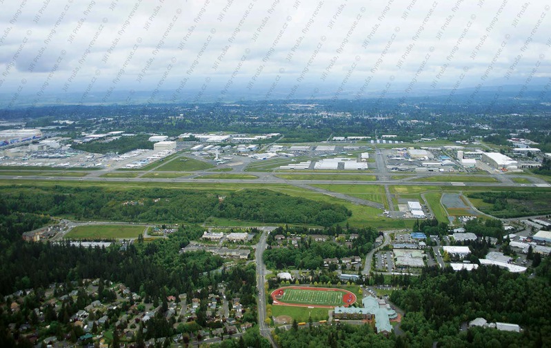 Everettu. Vlevo výrobní haly a vyrobená letadla na ploše u