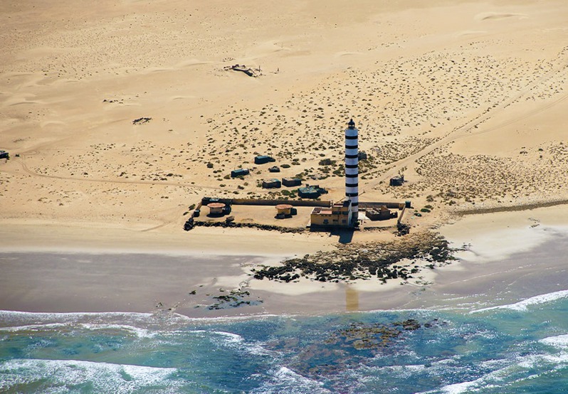 Na několika místech pobřeží stojí ale impozantní majáky. To, že tu mají svojí roli, dokazuje i skutečnost, že jen podél marockého pobřeží jsme viděli nejméně patnáct vraků ztroskotaných obchodních lodí, které v pobřežním písku bezvládně čekají, až je zničí rez. Jedním z majáků, které jsme za letu potkali, je maják El Cabino na pobřeží Západní Sahary v blízkosti města Boujdour.