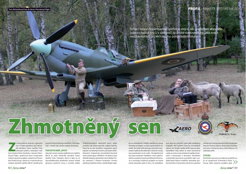 Za zhmotněním jednoho takového snu v České republice stojí občanské sdružení Czech Spitfi re Club, seskupení pilotů a leteckých nadšenců kolem Petra Svobody s názvem Pterodactyl Flight, společnost Aero Composites a hlavní sponzor projektu, společnost Promedica Praha Group. Jedná se o tvarově věrnou maketu slavného Spitfi ru Mk.IX. Využili jsme pozvání Petra Svobody a navštívili „Pterodaktyly“ v době, kdy výroba makety finišovala.