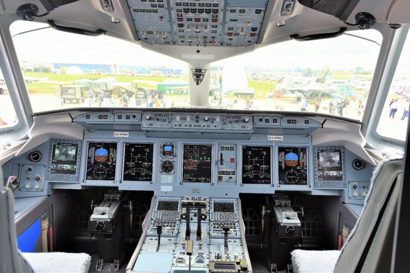 Pohled do kokpitu letounu SSJ100 MChS RRJ-95LR-100.