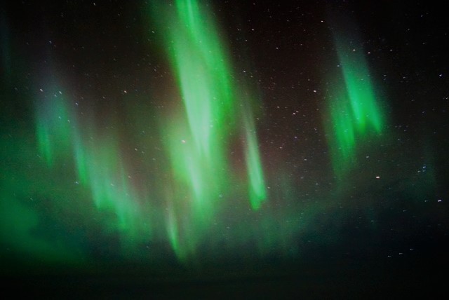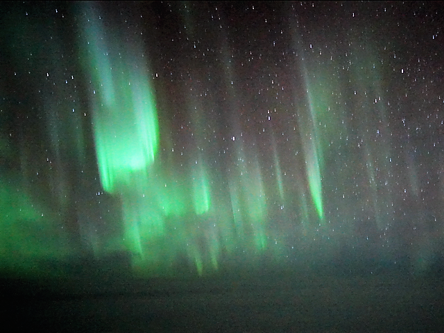 Při letech přes severní oblasti bývá vidět polární záře. Zde objektivem M. Srnce.