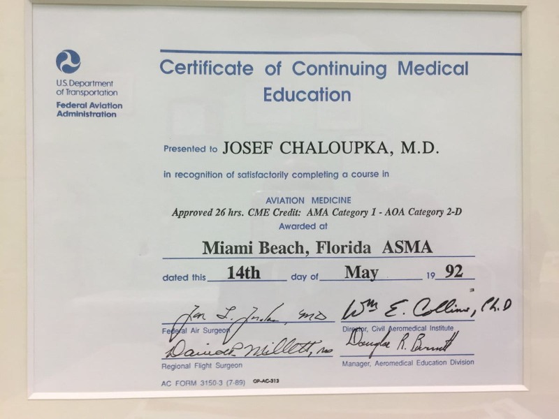Tím začaly mé pravidelné návštěvy Spojených států, neboť k udržení této kvalifikace bylo užitečné absolvovat každý rok odborné setkání leteckých lékařů. Myslím, že k obnovení kvalifikace je tam určitá benevolence, ale nejpozději jednou za tři roky je nutné se odborného setkání zúčastnit. A není to jenom školení, na závěr musíte napsat test. Až na základě úspěšně absolvovaného testu dostanete příslušný diplom, opravňující k vykonávání AME. Když tam jezdíte více než dvacet let, tak jich opravdu pár získáte.