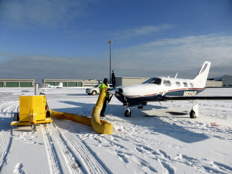 Ráno opět těsně před odletem dotankováváme, předehříváme motor a letadlo společně s pracovníky handlingu řádně odmrazujeme. Jsou tu na to dobře připraveni, protože pístová letadla jsou a snad ještě dlouho budou součástí provozu každého letiště. Diskuze o nejisté budoucnosti AVGASu tu sice také probíhá, ale negativním zvěstem zatím nikdo nevěří.