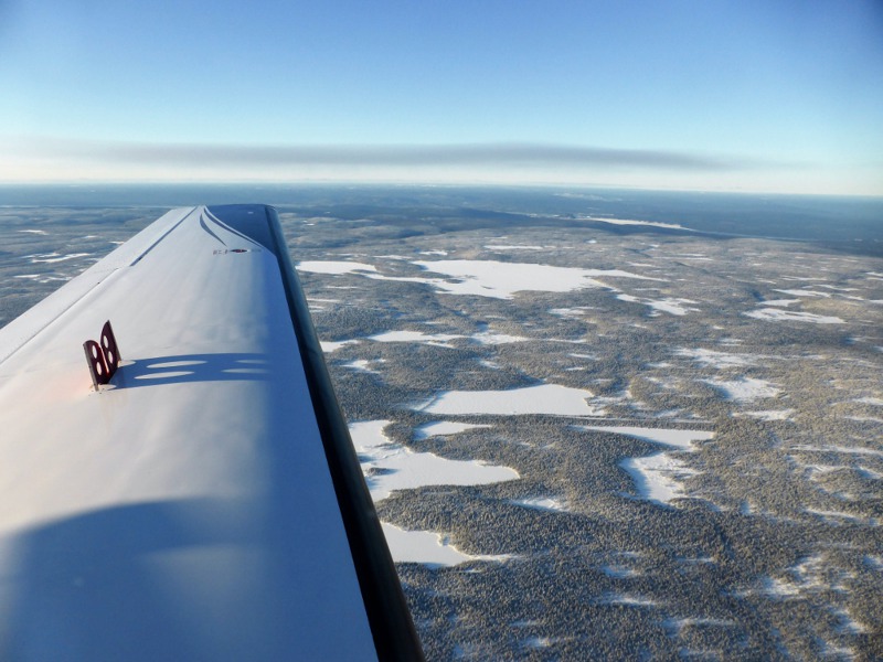 Odlet z Bangoru. Počasí je nádherné, letiště pod námi za chvíli uteče do minulosti. Jedna tenká "vrstvička" tak v 8000 stopách je po chvilce pod námi a my se vydáváme na sever, nad již řídce osídlená místa na hranici USA a Kanady.