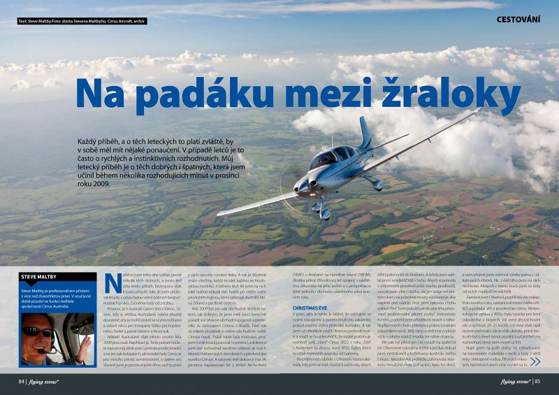 Někteří Australané však přesto onoho léta 2009 pracovali. Například já. Tedy pokud můžete nazvat můj džob prací, protože prodej letadel, a ne jen tak ledajakých, ale letadel řady Cirrus, je pro mnoho pilotů zaměstnáním, o jakém sní. Vlastně jsem je prodával ještě dříve, než ty první z nich opustily výrobní linku. A tak je důvěrně znám všechny, každý model, každou technologickou novinku. A během těch let jsem na nich také nalétal několik tisíc hodin po celém svém prodejním regionu, který zahrnuje Austrálii, Nový Zéland a pacifické ostrovy.