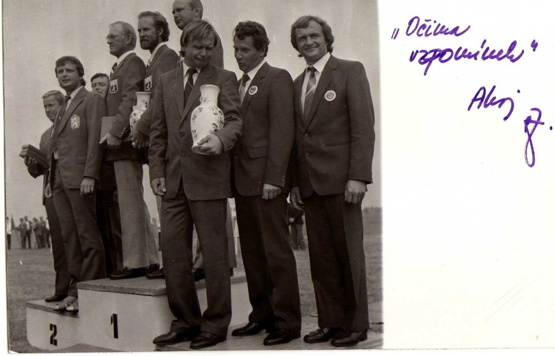 Mistrovství světa 1984 v Becescabe. Konečné výsledky družstev: 1. USA, 2. ČSSR 3. SSSR. Zleva Cico, pak já (M.Srnec) a Jirmus. Pátý zleva je můj současný velmi dobrý kamarád a majitel velkého leteckého muzea na Floridě Kermit Weeks.