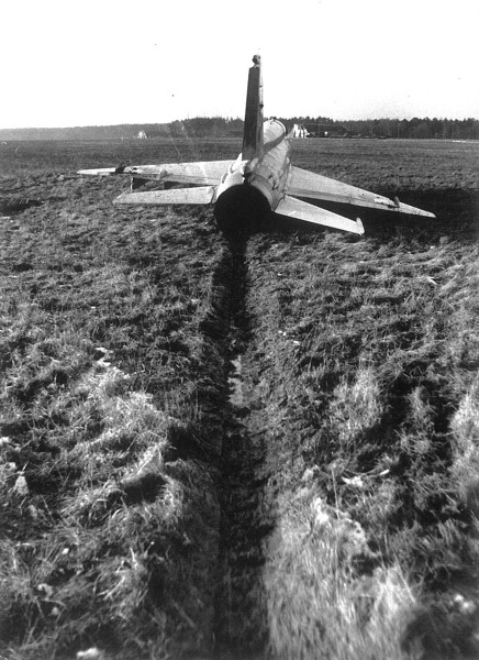 Měl jsem už jen málo paliva, tak mi nezbylo nic jiného, než jít na nouzové přistání. Podvozek zůstal zasunutý, nouzově jsem vysunul jen příďák, protože když se přistává nouzově s jedenadvacítkou, tak se musí vysunout příďák, aby se to nepřevrátilo. Tak jsem to udělal a šel jsem na přistání. Přistával jsem na travnatou plochu vlevo od dráhy. Na začátku jsem se dotkl země jen kýlem, který vytlačil v terénu jen takovou celkem tenkou rýhu. Po dosednutí na celý trup a ten příďák jsem jel podél dráhy a najednou se eroplán začal stáčet doprava. To znamenalo, že přejedu dráhu. Chtěl jsem to udržet směrovkou, náklonem doleva, ale nebylo to nic platné. Tak jsem tu dráhu přejel. A jak jsem ji přejížděl, tak to asi pěkně jiskřilo, protože jsem slyšel řídícího, jak křičí: Hasiči! Hasiči!