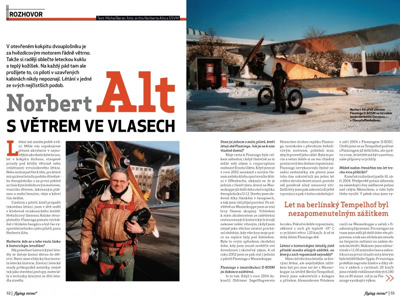S jedním z pilotů, kteří propadli takovému létání, jsem v létě seděl v klubovně strakonického letiště. Hvězdicový Siemens Halske dvouplošného Flaminga pomalu vychládal v blízkém hangáru a byl čas vyzpovídat jednoho z jeho pilotů, pana Norberta Alta.