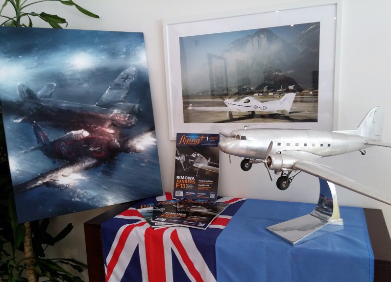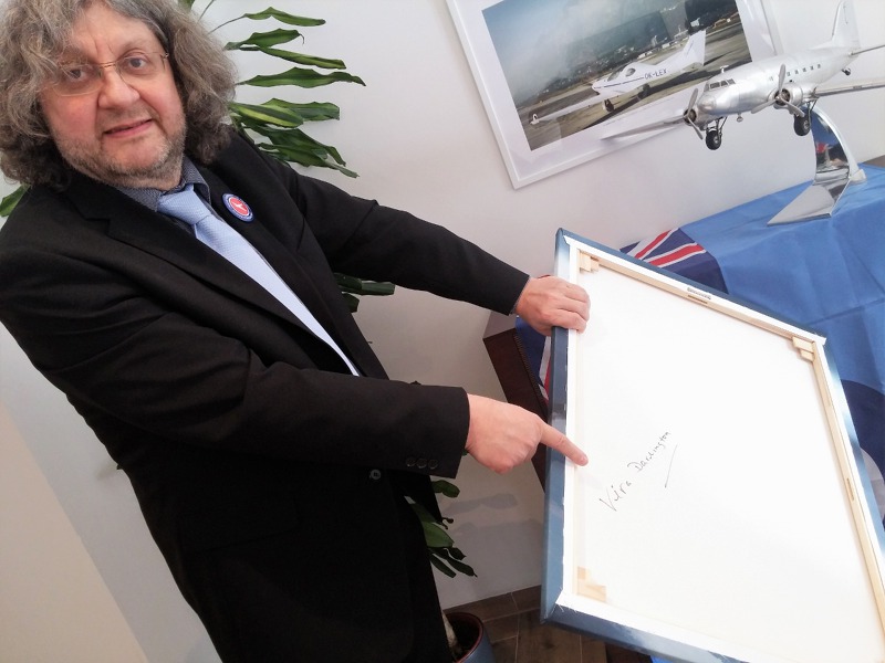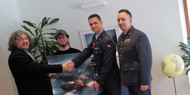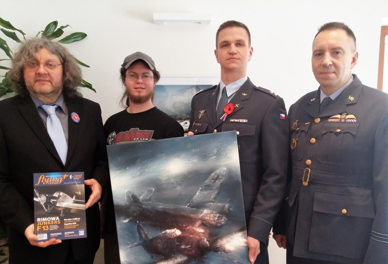 Slavnostní předání obrazu - zleva Jiří Soukup, autor obrazu Ondřej Soukup, Ondřej Bartoš, Zdeněk Sadecký. Foto: Jan Dvořák, Flying Revue