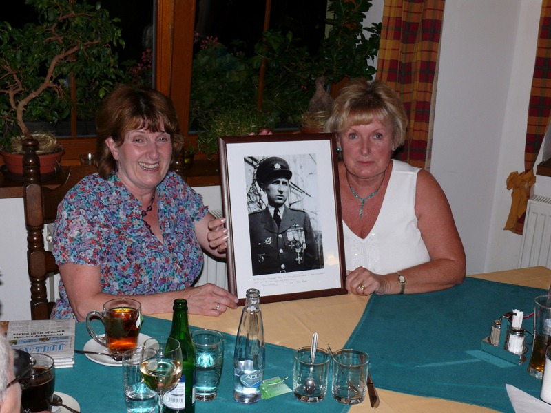 Dcery Karla Kuttelwaschera s obrazem otce - v bílém Mari Rowe, v modrém Vee Darlingtonová. Foto: Archiv Czech Spitfire Clubu