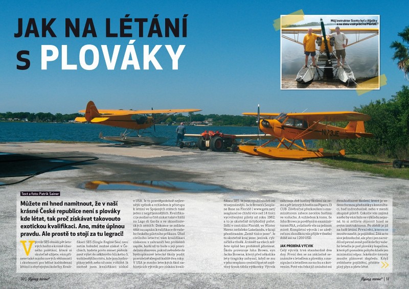 Výcvik SES obnáší pět letových hodin a kromě úžasného polétání, které si skutečně užijete, vám přinese také mnoho nových vědomostí i zkušeností pro běžné každodenní létání i s obyčejnými kolečky. Kvalifikaci SES (Single Engine Sea) není zatím bohužel možné získat v Čechách, budete proto muset podniknout výlet do některého blízkého či vzdálenějšího státu, kde jsou hydroplány ještě, nebo už zase, v oblibě. Já osobně jsem kvalifikaci získal v USA. Je to pravděpodobně nejlevnější způsob a vzhledem k přístupu k létání ve Spojených státech také jeden z nejpříjemnějších. Kvalifikaci je možné určitě získat také v Itálii na Lago di Garda a ve skandinávských zemích. Dokonce se můžete těšit na zapsání kvalifikace do vašeho českého pilotního průkazu. Úřad civilního letectví vám kvalifikaci získanou v zahraničí bez problémů zapíše, horší už to bude s její pravidelnou obnovou, pokud nebudete do hydroplánové letecké školy jezdit pravidelně alespoň každé dva roky. V USA je mnoho leteckých škol nabízejících výcvik pro získání kvalifikace SES. Já jsem využil služeb asi té nejznámější. Jack Brown’s Seaplane Base na Floridě ( www.gate.net/ seaplane) se chlubí více než 14 tisíci vycvičenými piloty od roku 1962, a to je skutečně úctyhodný počet. Sídlí v centrální Floridě, ve Winter Haven nedaleko Lakelandu, v kraji přezdívaném „Země tisíce jezer“. Je to skutečně kraj jezer, jezírek, rybníčků a tůněk. A téměř na všech můžete úplně bez problémů přistávat. Školu provozuje John Brown, syn Jacka Browna, který před několika lety tragicky zahynul, když se mu v jeho seaplanu uvolnil špatně zajištěný šroub táhla výškovky. Výcvik zahrnuje dvě hodiny školení na zemi a pět letových hodin na Piperu J3 CUB. Závěrečné přezkoušení s examinátorem zabere necelou hodinu ve vzduchu. A vzhledem k tomu, že John Brown je pověřeným examinátorem FAA, zvládnete vše na jednom místě. Kompletní výcvik i se závěrečnou zkouškou vás přijde v dnešní době asi na 1200 USD.