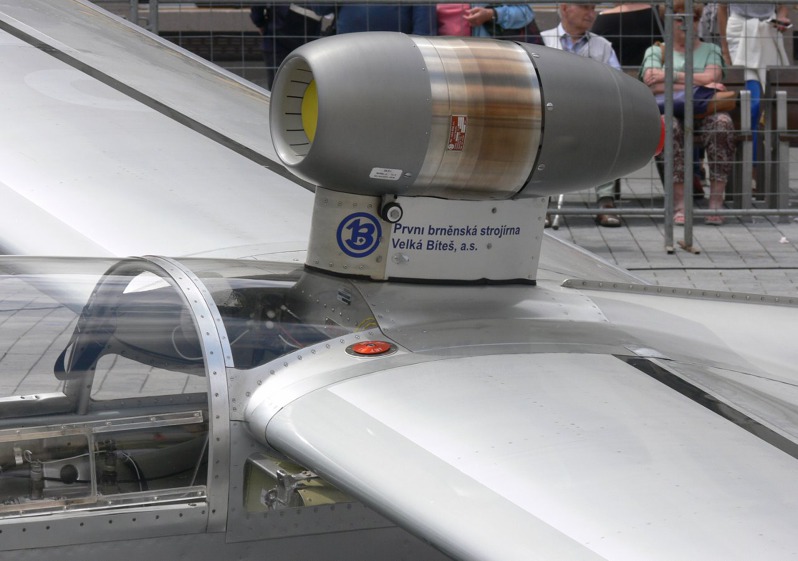 Stroj L-13 (OK-1840) vystavený na statické stojánce na leteckém dnu v Letňanech je aktuálně vybaven motorem verze TJ100 E2 s tahem 1100 N.