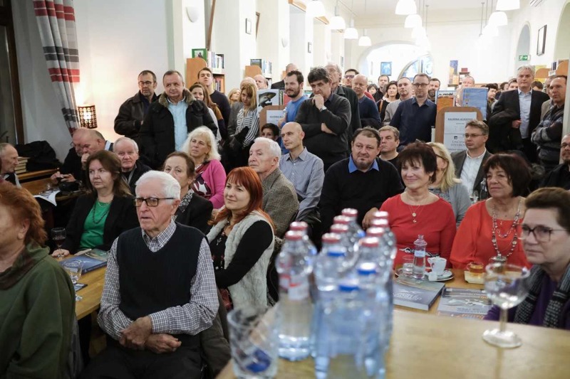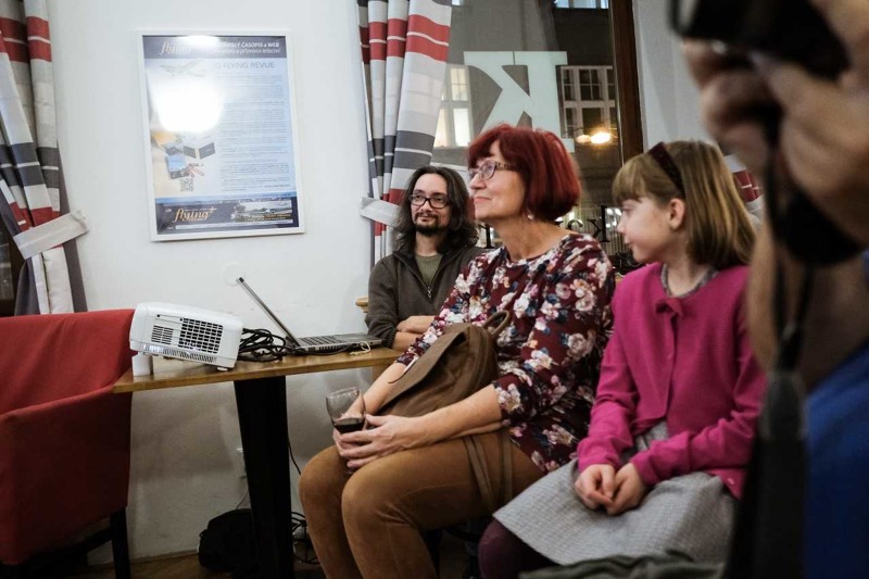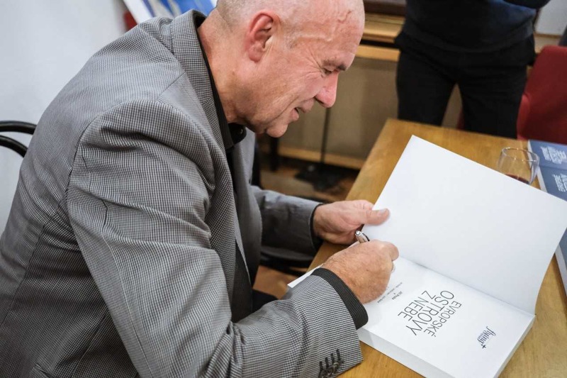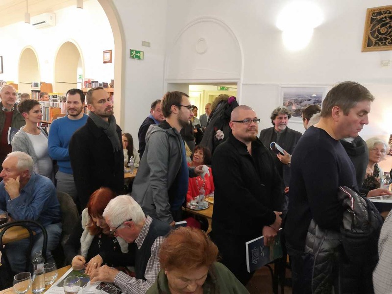 "Mám obrovskou radost, když vidím tolik lidí, kteří přišli knize popřát šťastný let na cestě ke čtenářům," svěřil se vedoucí autorského kolektivu knihy Jiří Pruša, když viděl, že poslední příchozí se do kavárny v prvním patře knihkupectví ani nevejdou a musí se tísnit mezi knižními regály na kavárnu navazujícími.