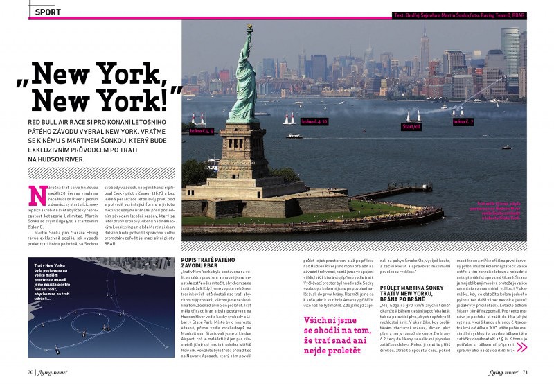 Red Bull Air Race (RBAR) si pro konání letošního pátého závodu mimo evropský kontinent nemohl vybrat lepší lokaci. New York City, kosmopolitní ikona USA a dlouhodobý cíl managementu RBAR, se ukázal jako ideální spojení atraktivního panoramatu a maximálního mediálního zájmu, kterého se pro letošní rok seriálu vůbec dostalo. Náročná trať se ve finálovou neděli 20. června vinula na řece Hudson River a jedním z dvanáctky startujících nejlepších akrobatů světa byl český reprezentant kategorie Unlimited, Martin Šonka se svým Edge 540 a startovním číslem 8. Martin Šonka pro čtenáře Flying revue exkluzivně popíše, jak vypadá průlet tratí bránu po bráně, se Sochou svobody v zádech, na jejímž konci si připsal český „ace of aces“ s časem 1:16.78 a bez jediné penalizace letos svůj první bod a potvrdil vzrůstající formu a jistotu mezi vzdušnými bránami před posledním závodem letošní sezóny, který se letěl druhý srpnový víkend nad německým Lausitzringem a kde Martin ziskem dalšího bodu potvrdil správnou volbu promotéra zařadit jej mezi elitní piloty RBAR.