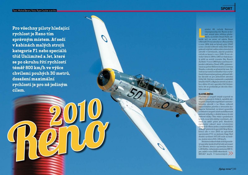 Letošní 48. ročník National Championship Air Races se konal, stejně jako většina předešlých, na letišti Stead Field, několik mil na sever od města Reno v Nevadě. První závody se u Rena letěly v roce 1964, kdy se bývalý pilot USAF a eso z druhé světové války Bill Stead pokusil vzkřísit zašlou slávu leteckých závodů v Clevelandu, jejichž poslední ročník se konal v roce 1949. První závody v létech 1964 a 1965 se však konaly ještě na místě zvaném Sky Ranch Airfield. V roce 1966 byla uzavřena vojenská základna Stead AFB, pojmenovaná na počest Billova bratra Crostona Steada, a závody se přemístily tam. Závodí se na tratích oválného tvaru vytýčených barevnými pylony, přičemž délka okruhů se pro jednotlivé závodní třídy liší. Zatímco nejmenší a nejslabší letadla tříd F1 a Biplane závodí na okruhu o délce tří mil, speciály tříd Unlimited a Jet se prohánějí po okruhu dlouhém osm mil.