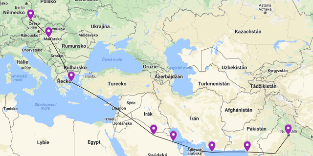 Trasa Praha - Nové Dillí zaznamenaná na Google mapě mise Okřídlený lev.