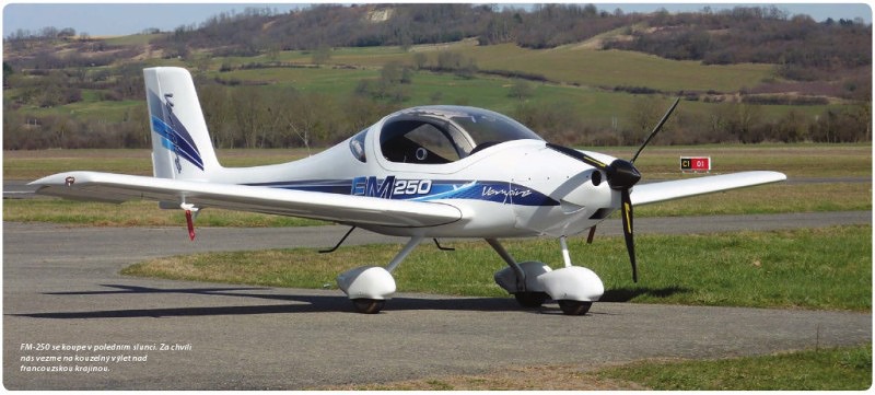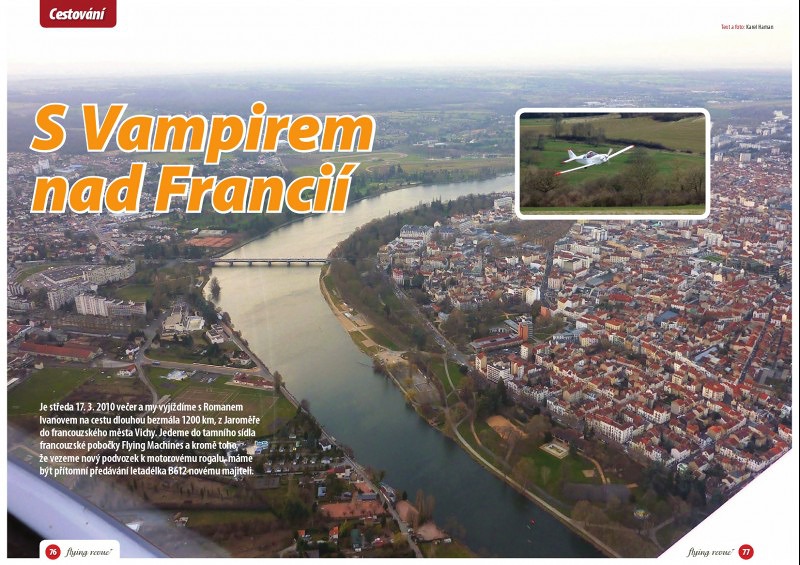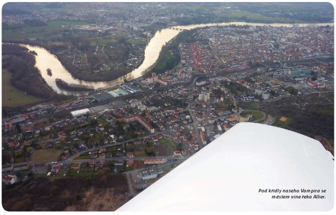 Odpoledne nás naše GPS zastavuje přímo před hangárem francouzské Flying Machines na letišti ve Vichy. Vítá nás Christian Balansino, šéf francouzské odnože firmy, která na letišti sídlí v jednom z velmi příjemně vybavených hangárů. Zapomínáme, že jsme vlastně v noci nespali, a pokračujeme prohlídkou letiště a některých zajímavých místních strojů, jež se ukrývají ve zdejších hangárech. Seznamujeme se přitom i s lidmi starajícími se o bezchybný provoz zdejšího letiště vybaveného i poměrně velkou odbavovací halou. Předpověď na následující den není bohužel úplně ideální, a tak na nic nečekáme a využíváme momentální slušné podmínky k polétání s Vampirem FM 250 po nádherném okolí a pouštíme se také nad francouzský historický klenot, město Vichy. To se sice nevyznačuje rozlohou velkoměsta, ale krásné historické stavby, kterých je ve centru města plno, vypovídají hodně o jeho slavné minulosti. Vše si prohlížíme důkladně ze vzduchu a doufáme, že náš tichý Vampír jistě nikoho na zemi neruší. Létáme až do večera, přičemž pilotování si užívají hlavně Christian a Roman a já se věnuji prohlížení místních zajímavostí a focení. Okolí města je opravdu nádherné a teprve ze vzduchu je možné spatřit skutečnou velikost a vhodné umístění zdejšího letiště.