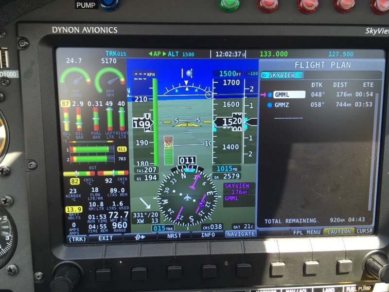 Tady jsem nevěděl, jestli doletím do cíle: Remaining time OK-LEX vlevo (4:55h) a Total remaining co se týče zbývající trasy (vpravo - 4:43 h.) jsou skoro stejné a já v té chvíli letěl v silném protivětru. Takže to nevypadalo úplně dobře.