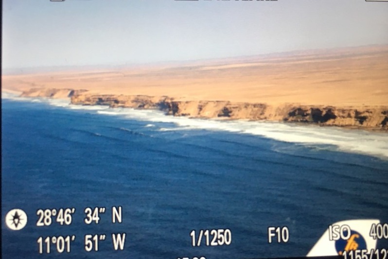 Pobřeží Západní Sahary. 120 km přes moře na druhé straně leží Kanárské ostrovy. Přefoceno nouzově mobilem z displeje fotoaparátu.