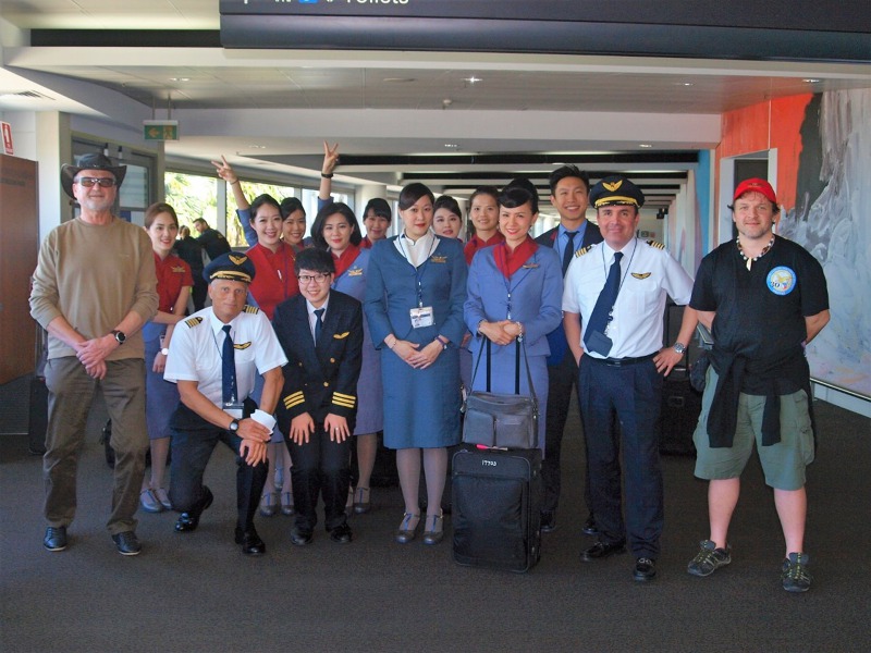 Přesto nám však bylo velkým potěšením opět se po přistání setkat s posádkou. Ano, ani tentokráte jsme nevynechali. Je to od nás možná drzé, leč jak se říká, líná huba, holé neštěstí. Regule letecké společnosti nám sice nedovolily nahlédnout do kokpitu, nicméně jsme se mohli sejít před výstupním chobotem. A s celou posádkou! Tahle byla navíc vpravdě mezinárodní - stroj pilotovali Rus a Španěl, palubní personál byl z Číny. Všichni ale naprosto přátelští a veselí.