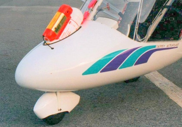 4. Na letounu byl namontovaný motor Rotax 503 s reduktorem otočeným směrem dolů a s třílistou dřevěnou vrtulí Křemen o průměru 1800 (!) mm. Těžiště pohonné jednotky tak bylo podle mého odhadu asi 800 mm za a 900-1000 mm nad těžištěm letounu.