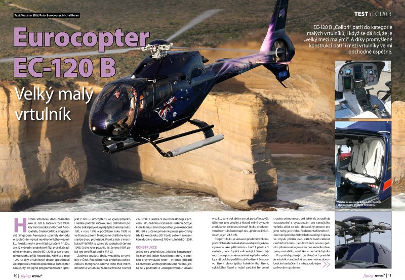Jedná se o vrtulník tzv. „klasické konstrukce“. To znamená jeden hlavní rotor, který je doplněn o vyrovnávací rotor – v tomto případě o Fenestron. Velmi zjednodušeně řečeno, jedná se v podstatě o „zakapotovanou“ ocasní 10 | Text: Vratislav Eliáš/Foto: Eurocopter, Michal Beran EC-120 B „Colibri“ patří do kategorie malých vrtulníků, i když se dá říci, že je „velký mezi malými“. A díky promyšlené konstrukci patří i mezi vrtulníky velmi obchodně úspěšné. vrtulku, konstruktérům se tak podařilo zvýšit účinnost této vrtulky a hlavně velmi výrazně zredukovat celkovou úroveň hluku produkovaného vrtulníkem (např. tzv. „přeletová hlučnost“ je jen 78,8 dB).