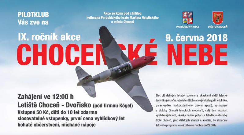 Choceňské nebe 2018 Už podeváté se v sobotu 9. června 2018 v Chocni na Pardubicku potkají ultralehké stroje na svém tradičním sletu. Ten doprovodí další ukázky letecké techniky, akrobatická vystoupení, chybět nebude ani možnost vyhlídkového letu a program pro děti.