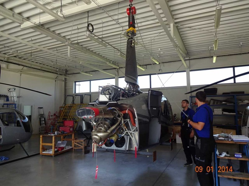 Po přípravě všech celků začíná samotná kompletace vrtulníku. Reduktor se vyjme z bedny a pomocí zdvihacího zařízení vytáhne do potřebné výšky. Poté se přiveze kabina vrtulníku ještě připevněna ke dnu transportní bedny a reduktor se nachystá nad ní. Následuje montáž reduktoru, která je náročnější na čas a manipulační prostor mezi reduktorem a prutovinovým rámem kabiny. Reduktor se usadí a spojí s rámem pomocí čepů. Připojí se táhla řízení na cykliku a část transmise na zadní reduktor. Souběžně se provádí připojování hadic reduktorového oleje, brzda hlavního rotoru, sestava klimatizace a propojení elektrického systému a konektorů.