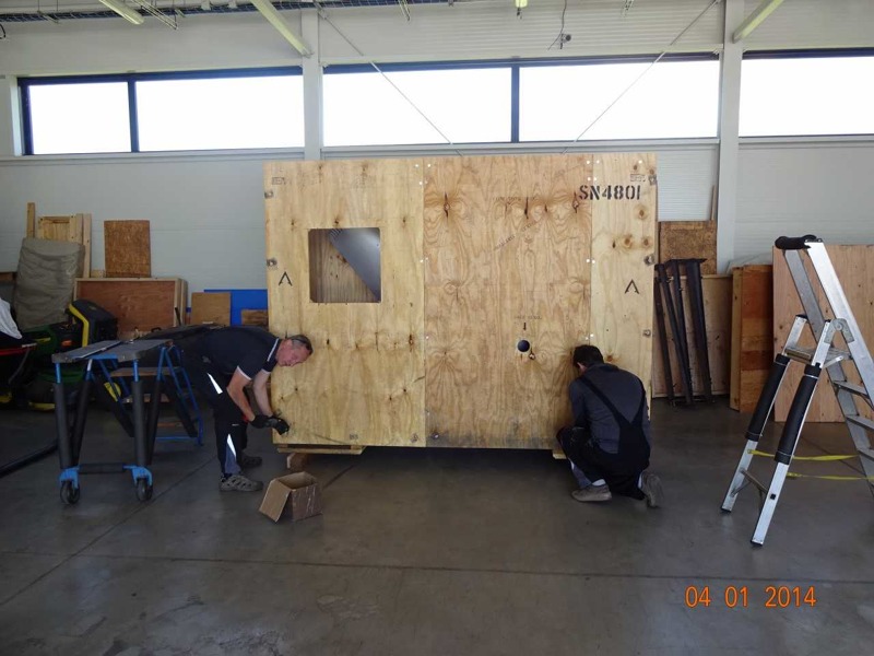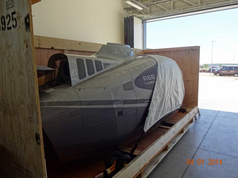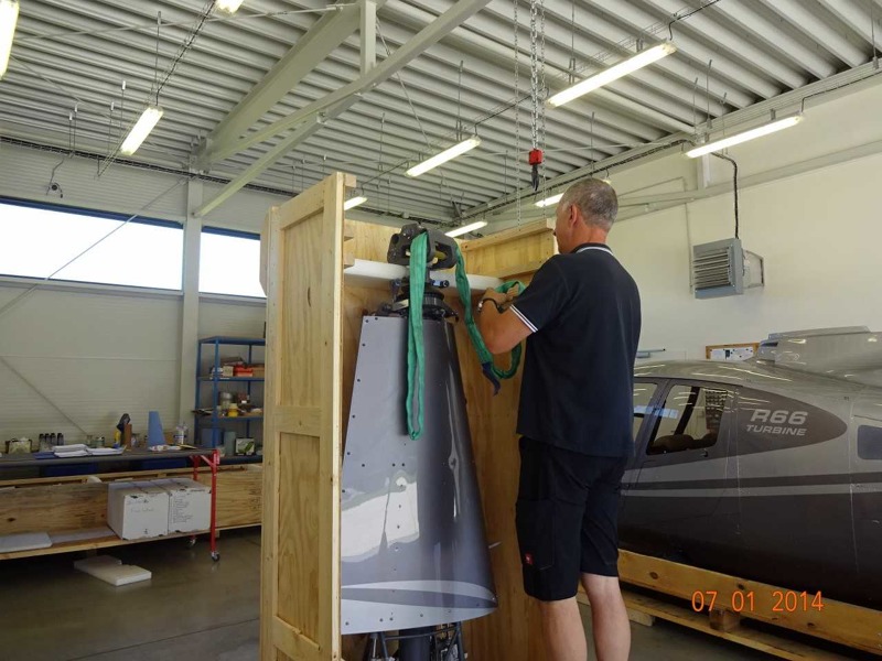 Jakmile kontejner "přistane" na ploše před hangárem NISA NISA AIRu v Mladé Boleslavi, jde to už ráz naráz. Po vyložení nákladu a prvotní kontrole letadlových celků rozložených do tří dřevěných beden se bedny přesunou do hangáru. První bedna obsahuje kabinovou část s motorem. Ve druhé se nachází ocasní část, listy hlavního rotoru, rozložený podvozek a ocasní rotor. Třetí bedna obsahuje hlavní reduktor a hlavu hlavního rotoru. Různé menší části vrtulníku, vybavení, doplňky, dokumentace a spojovací materiál jsou vloženy do kabiny pod sedadla, nebo do zavazadlového prostoru R66, který výrobce šikovně využije na transport.